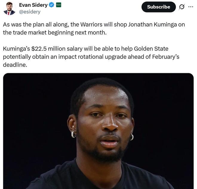 随后记者Evan Sidery跟进曝出,勇士将按照原有计划从下个月开始探索库明加的交易市场。